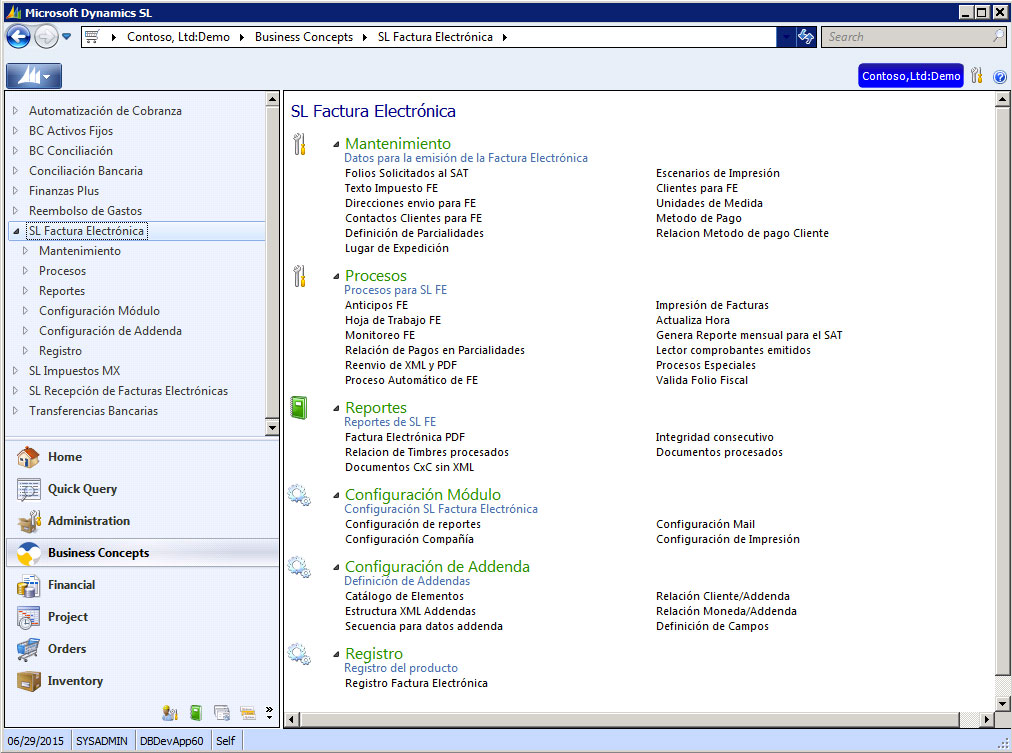Los Módulos de Business Concepts SL, incluidos SL Impuestos Mx 2020, SL Factura Electrónica 2019, SL Recepción Factura Electrónica, Transferencias Bancarias y Activos Fijos, abordan los desafíos operativos para los usuarios de Microsoft Dynamics SL.