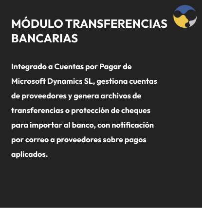 Integrado al proceso natural de generación de cheques en Cuentas por Pagar de Microsoft Dynamics SL, permite administrar las cuentas bancarias de proveedores y generar los archivos de transferencias o protección de cheques para importación en el portal del banco.